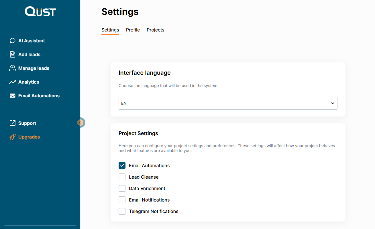Here you can choose the interface language and configure your project settings and preferences. These settings determine how your project works and which features are available to you.