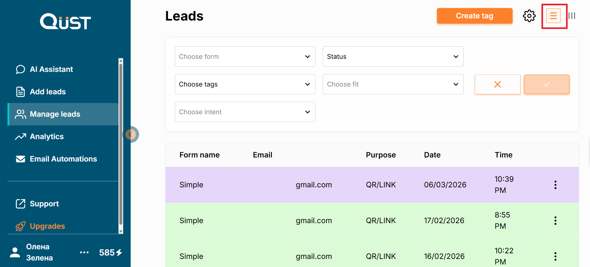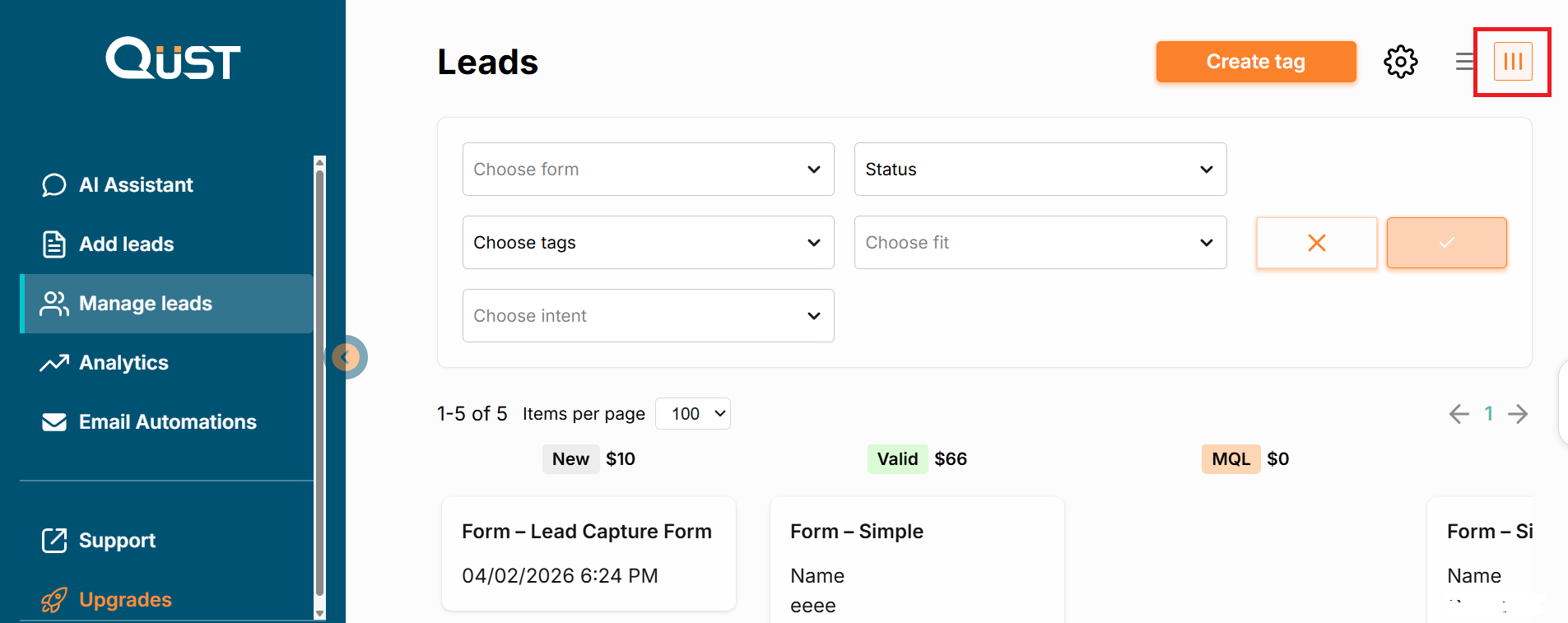 Kanban view (сlick 3 vertical lines): displays items as cards organized into columns based on their status or stage.