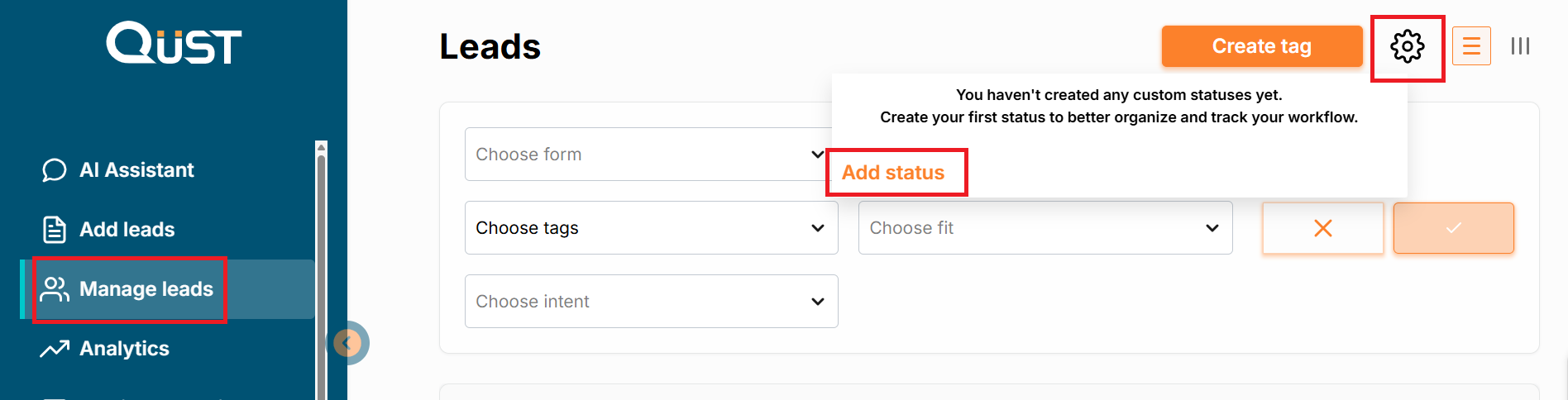 Go to the “Manage Leads” menu and find the gear icon in the top-right corner. Click it and select “Add status”. Enter a name for the new status and assign a color. Click the checkmark icon to the right of the status name to save it. Now the new statuses will be available for selection in the settings of each lead.