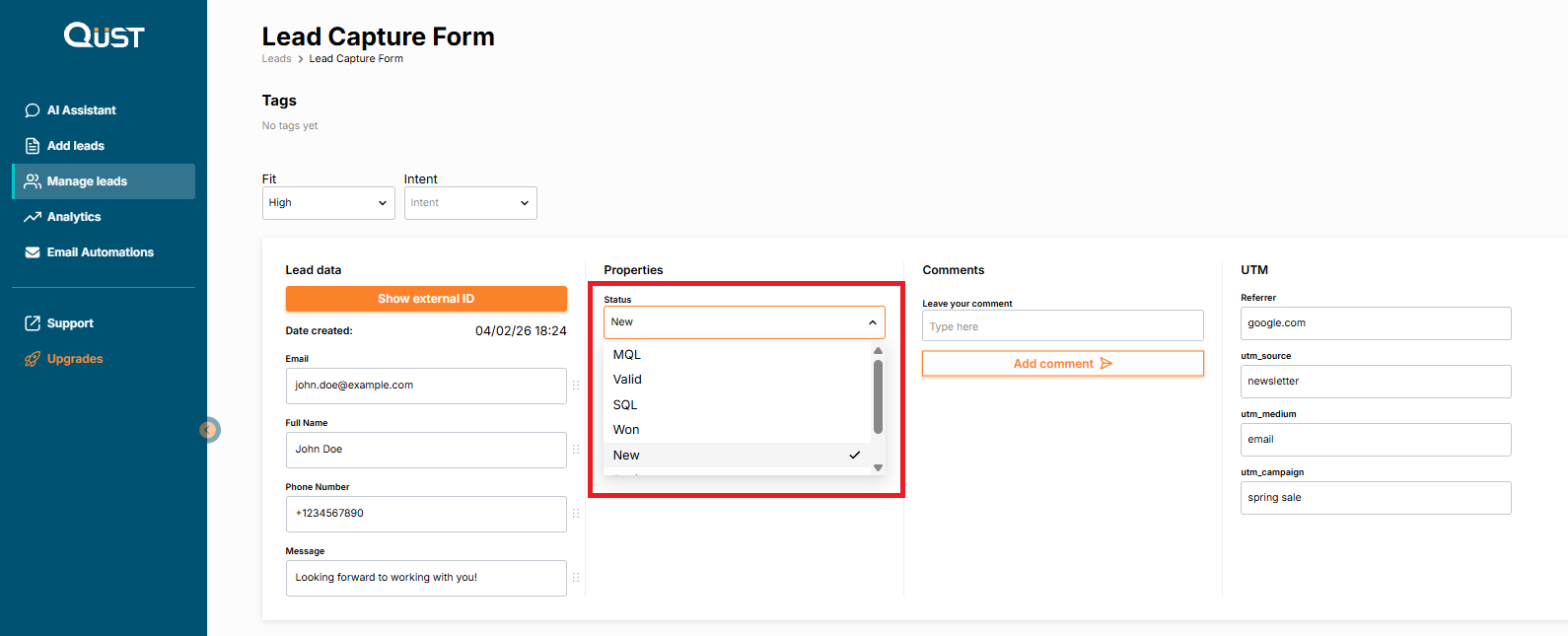 Click on the lead, then in the “Properties” column select the lead status from the dropdown list.