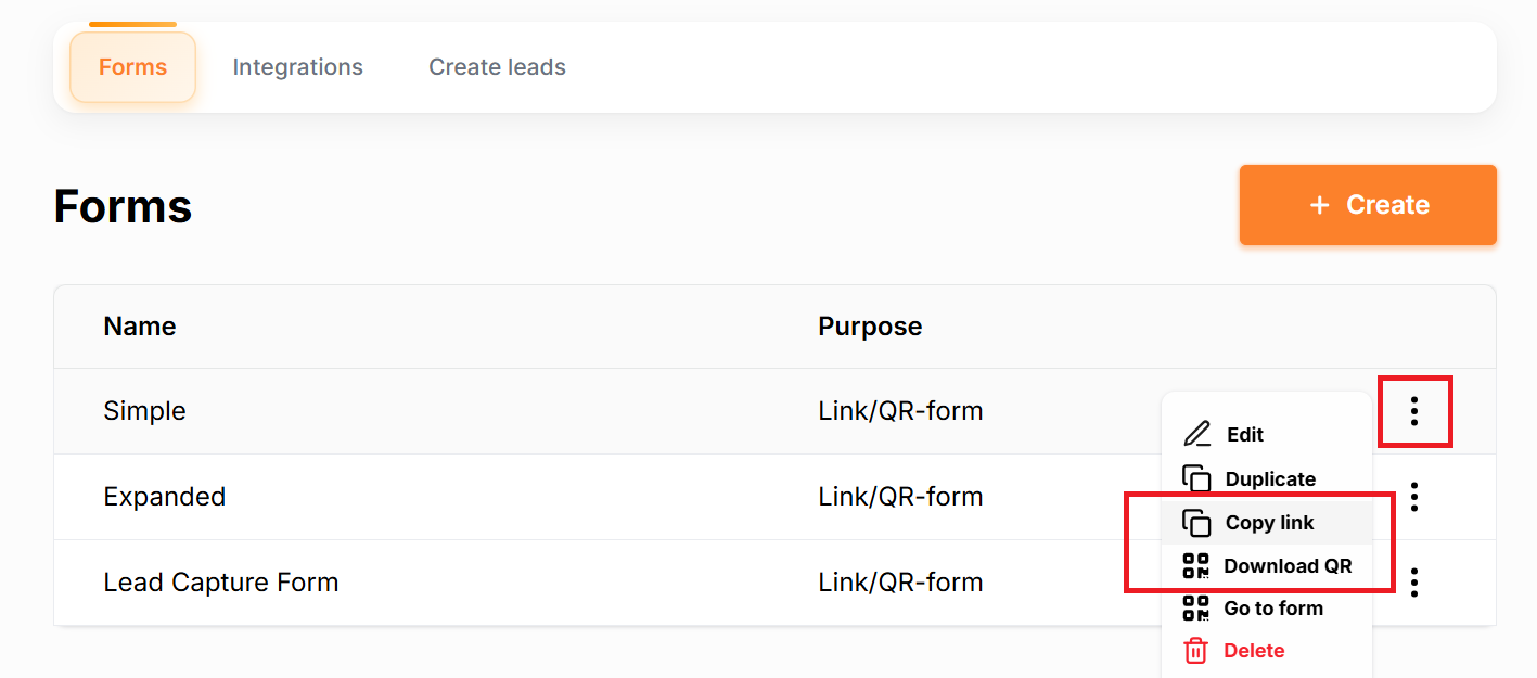 Find the required form in the table and click the three dots on the right side of its row. In the menu that appears, select the option to view or copy the link or QR code.