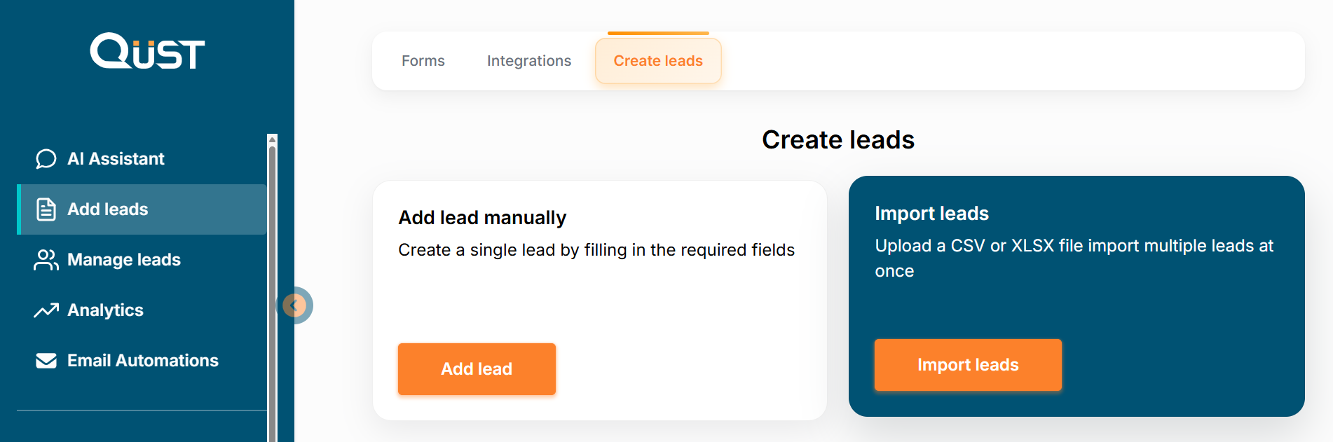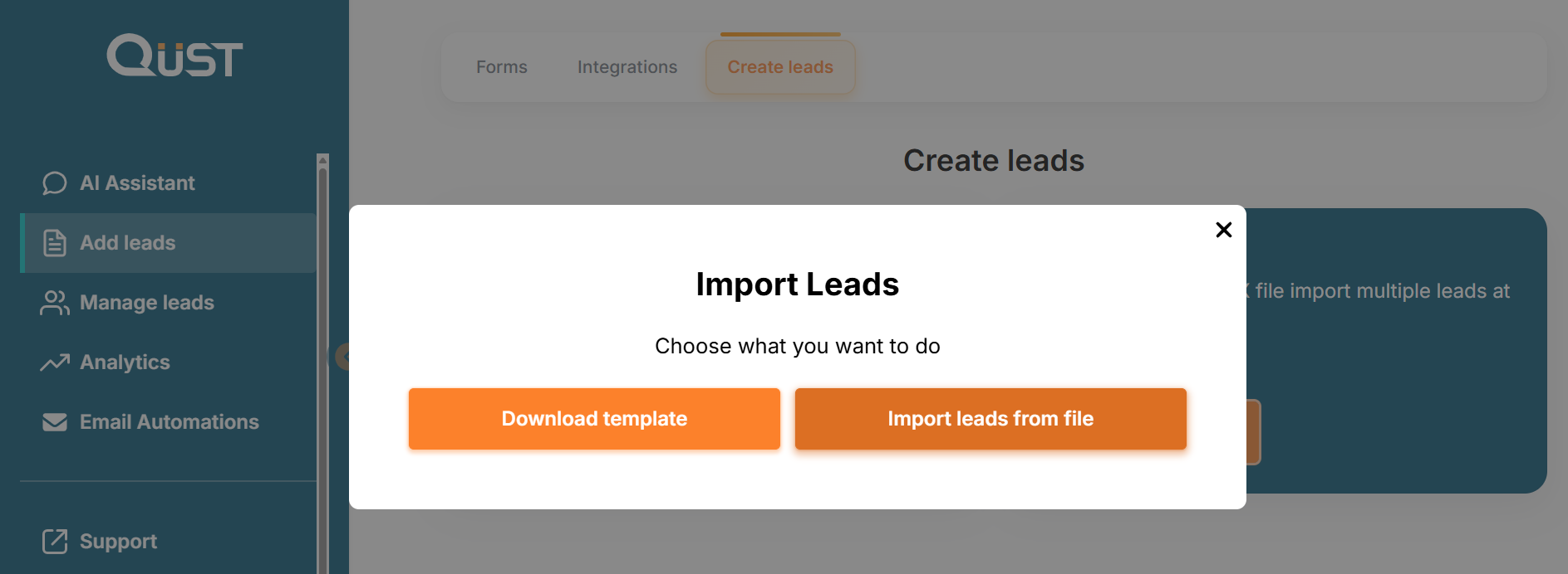 Go to the “Add Leads” section in the left menu, select “Create Leads”, then choose “Import Leads”. Here you can upload a CSV or XLSX file and import multiple leads at once. Click on "Import Leads", then choose what you want to do: Download template or Import leads from file.